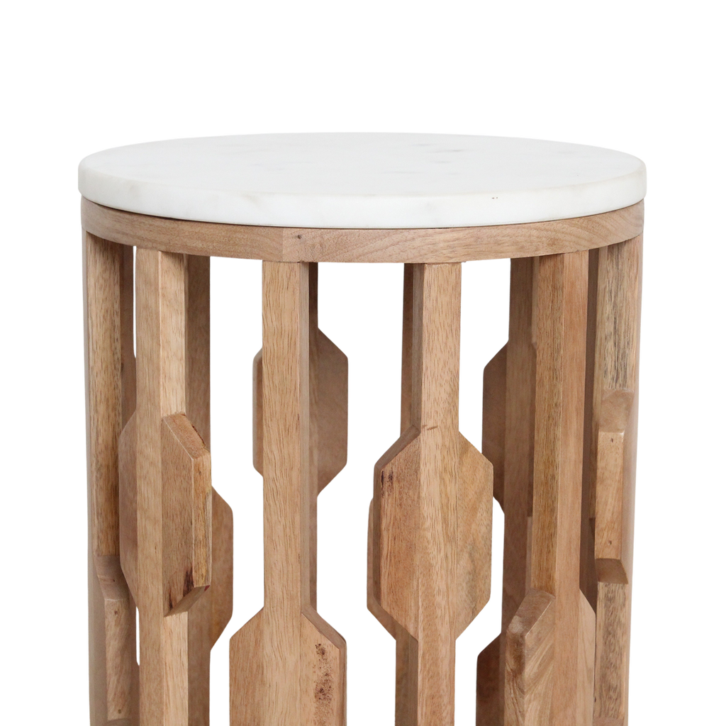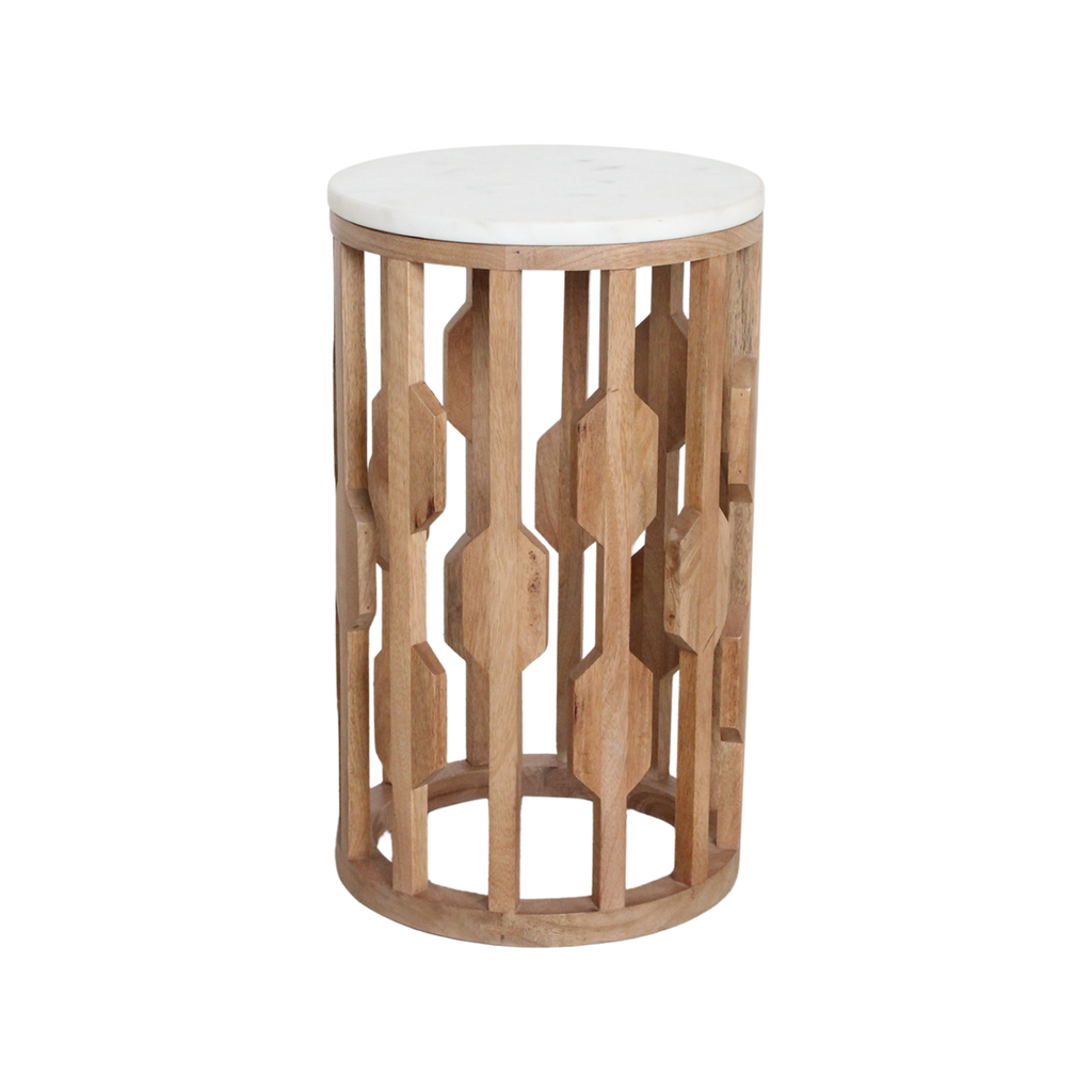De ronde marmeren bijzettafel combineert een gladde, witte marmeren blad met een onderstel van naturel mangohout. Die natuurlijke combinatie van koel marmer en warm hout zorgt voor een evenwichtige uitstraling — strak en modern, maar met een zachte touch. Elk blad toont zijn eigen unieke marmertekening, waardoor geen twee tafels precies gelijk zijn. Het duurzame mangohout is afkomstig van bomen die na hun vruchtperiode een tweede leven krijgen, wat deze marmeren bijzettafel niet alleen mooi, maar ook verantwoord maakt.
