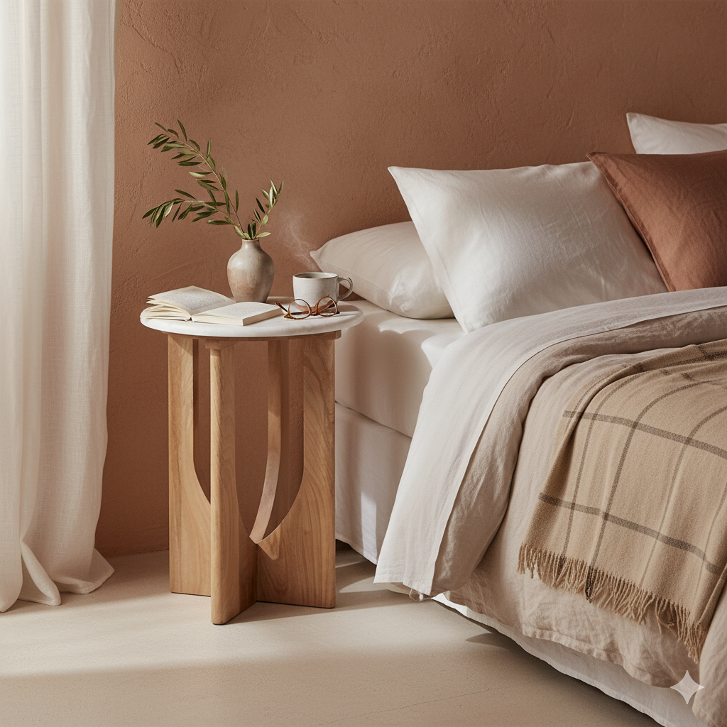 Een tafel die met zijn zachte kleuren en natuurlijke materialen rust brengt — eenvoudig, warm en blijvend mooi.