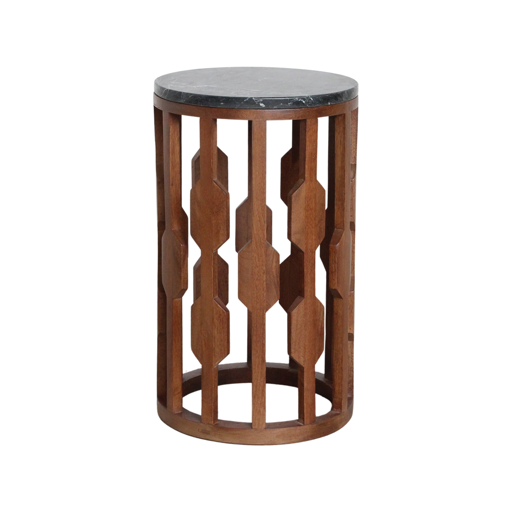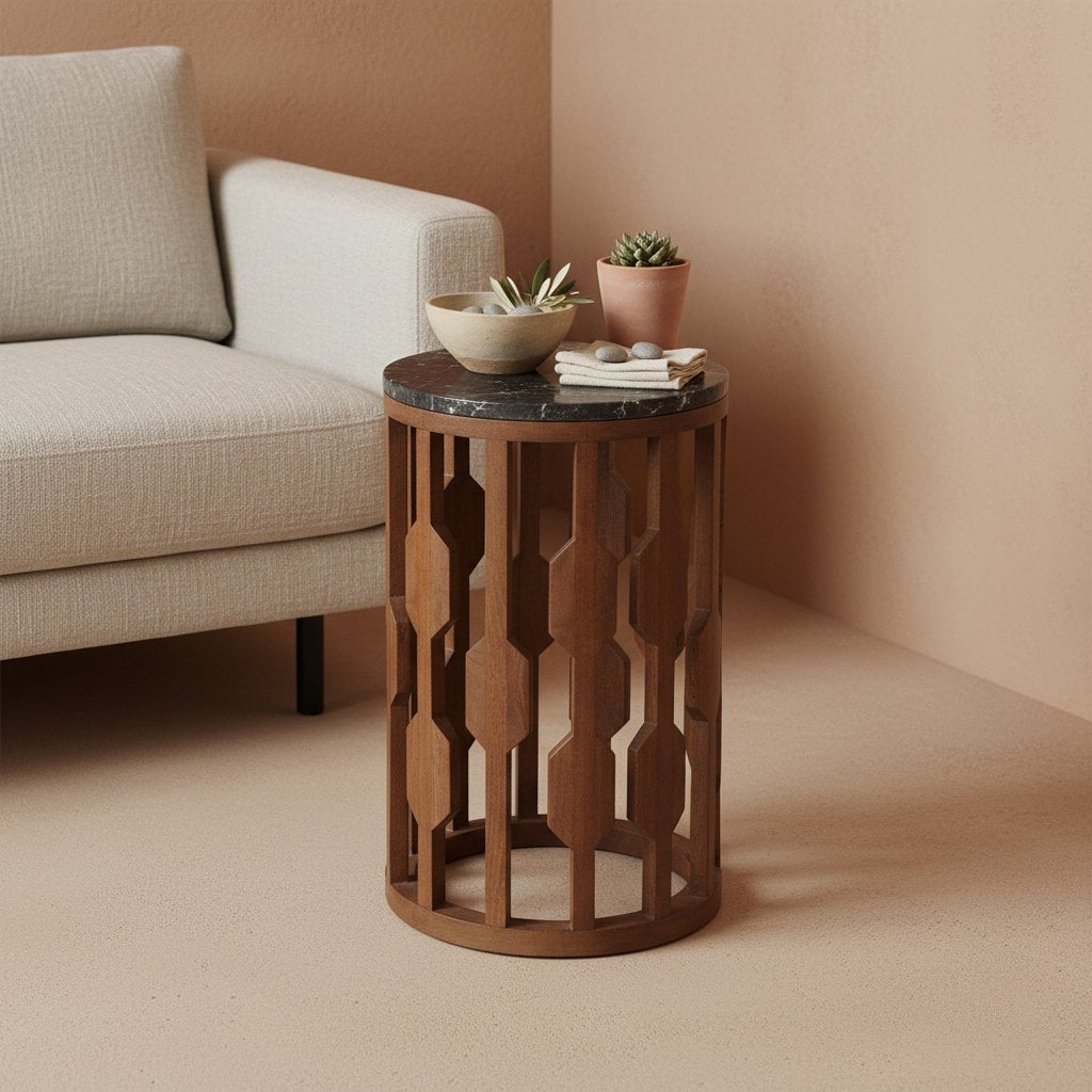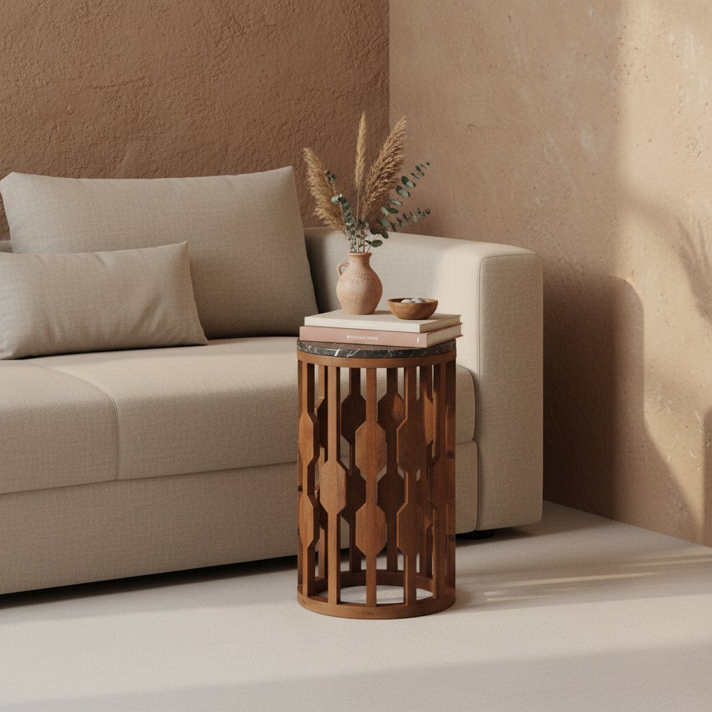 Het zwarte marmer toont een spel van lichte aders die bij elke tafel anders lopen. Geen twee bladen zijn gelijk, waardoor elk exemplaar zijn eigen karakter heeft. Het mangohout is afkomstig van bomen die na hun vruchtperiode worden hergebruikt. Het hout wordt met zorg bewerkt, zodat de natuurlijke nerven en warme kleur mooi zichtbaar blijven. Zo ontstaat een bijzettafel die niet alleen stevig en tijdloos is, maar ook een verhaal vertelt.