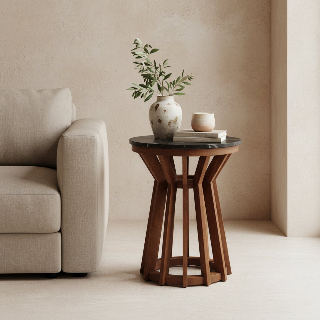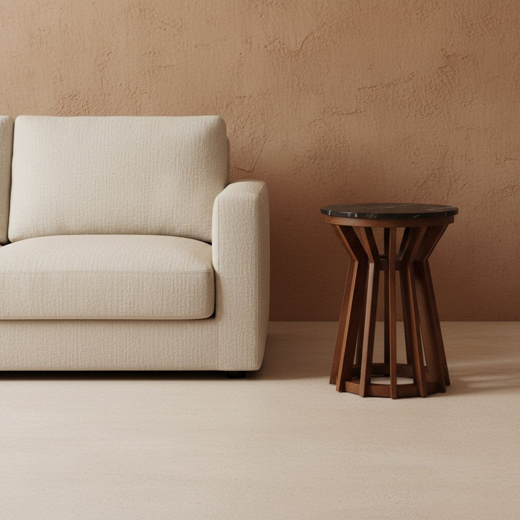 De Sabah bijzettafel marmer zwart brengt een eigentijdse sfeer in huis. Het diepe zwarte marmeren blad combineert met het warme, bruine mangohouten onderstel tot een tafel die rust en karakter uitstraalt. Het compacte formaat en de strakke lijnen maken deze bijzettafel perfect passend in een modern, Japandi of industrieel interieur.