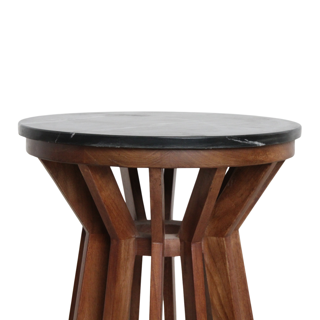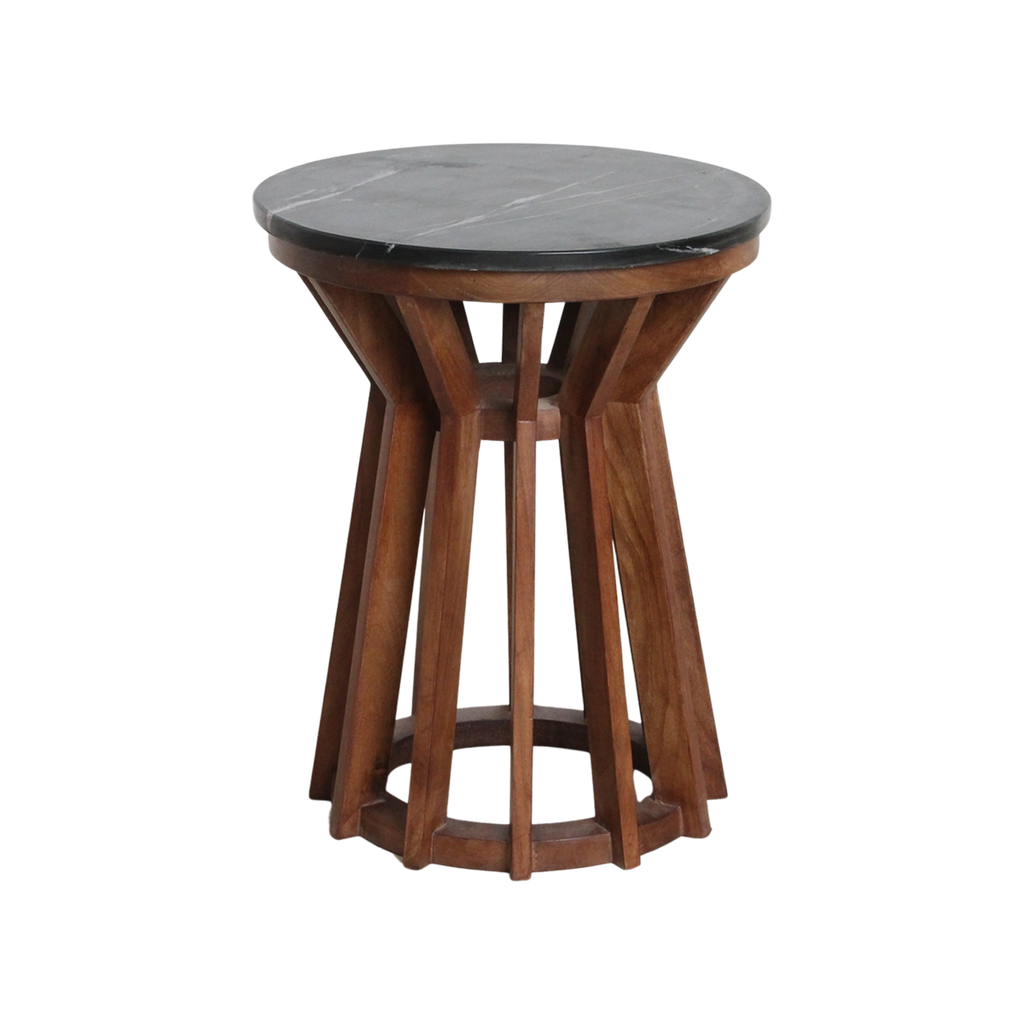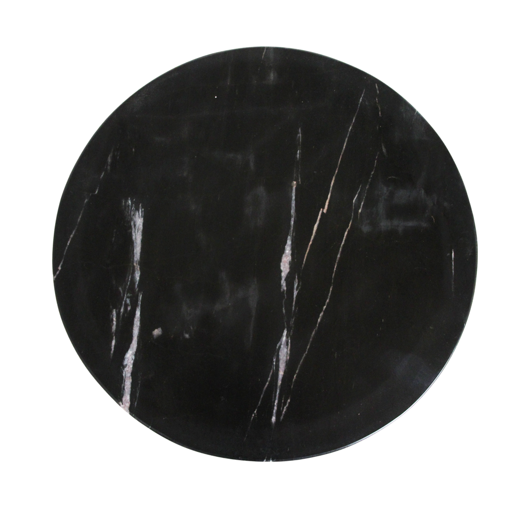 Het ronde blad is gemaakt van zwart marmer met subtiele aders die elk exemplaar uniek maken. Het mangohouten onderstel heeft een kruisvormige constructie en laat de natuurlijke houtnerf duidelijk zien. Het hout is afkomstig van mangobomen die na hun vruchtperiode een tweede leven krijgen, waardoor de tafel duurzaam is en een natuurlijke uitstraling behoudt.