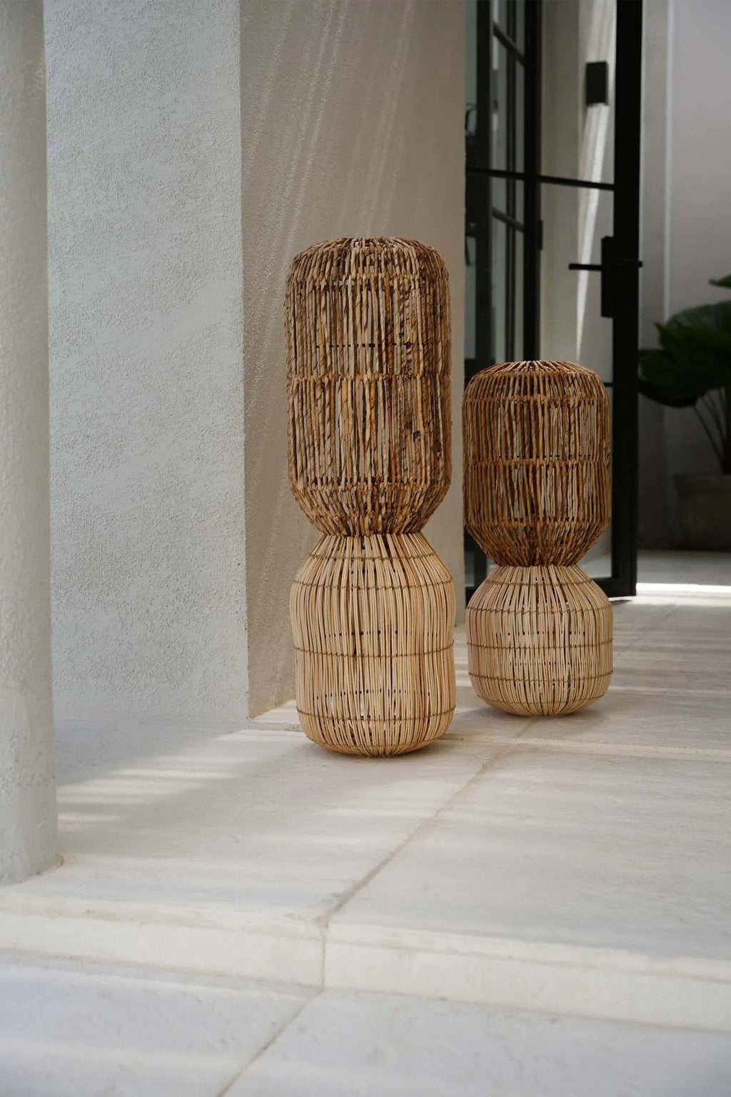 De ChemChem Lamp, gemaakt van bananenblad en rotan, biedt een veelzijdige stijl als hanglamp of staande lamp. Het unieke ontwerp en de aardse texturen maken het een opvallend item dat prachtig past bij boho, rustieke of kustinterieurs. Of het nu boven een eettafel hangt of sierlijk in een knus hoekje staat, de ChemChem Lamp verspreidt een warme, uitnodigende gloed die elke kamer transformeert tot een serene oase. De handgemaakte details en natuurlijke materialen creëren een perfecte harmonie tussen functie en design.