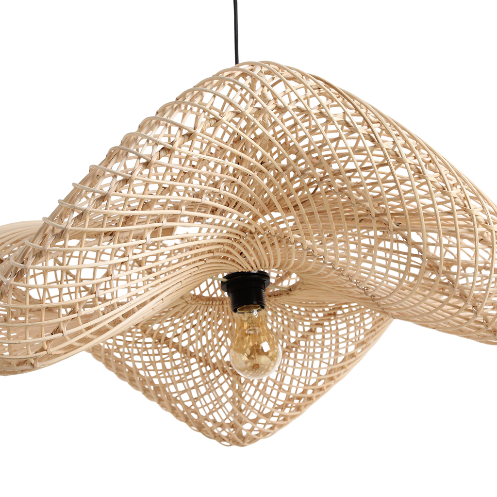 De Wave lampen worden met de hand gemaakt van natuurlijk rotan. Rotan is een klimmende palm of liaan die bomen gebruikt als ondersteuning en tot wel 100 meter lang kan groeien. Het merendeel van de rotansoorten groeit in de tropische bossen van Zuidoost-Azië, waarvan 70% in Indonesië. Het weven van lampen, meubels en manden is een ambacht dat van generatie op generatie wordt doorgegeven. De Wave collectie is geïnspireerd door bestaande vintage lampontwerpen, met een modern tintje van onze ontwerpers. De lamp wordt geleverd met een stijlvol stoffen snoer en een zwart metalen plafondkapje.